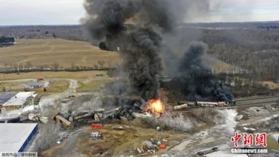 2月4日,俄亥俄州東巴勒斯坦城脫軌列車在燃燒。
