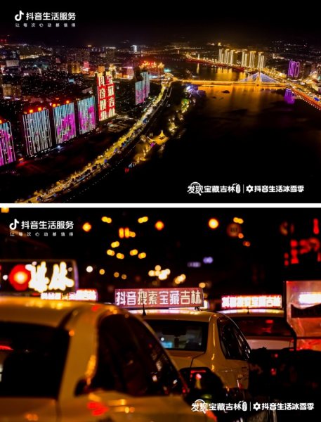 借助短視頻的傳播,吉林震撼的冬季霧凇景觀被更多網友看到。進入12月,抖音生活服務在吉林市阿什小霧凇島落地“登島趕大吉”活動,帶動小霧凇島搜索量創(chuàng)冬季新高,吉林市抖音團購搜索量顯著增長。系列活動得到吉林市委市政府的大力支持。華燈初上,吉林市松花江畔的地標樓體上燈光閃爍著“抖音搜索,寶藏吉林”字樣。全市穿梭街巷的數千輛出租車車頂燈箱,也在提醒本地市民及異地游客關注“發(fā)現寶藏吉林”活動。