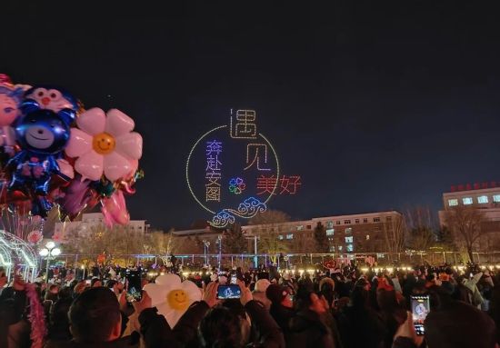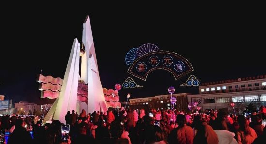 隨后,萬(wàn)眾期待的無(wú)人機(jī)表演正式亮相,千余架無(wú)人機(jī)在夜空中緩緩升空,隨著音樂(lè)節(jié)奏不斷變換造型,“元宵”“飛馳的駿馬”“翱翔天空的巨龍”等圖案,“喜樂(lè)元宵”“遇見(jiàn)美好奔赴安圖”等字樣在夜空中次第呈現(xiàn),勾勒出唯美浪漫的立體畫面,引得現(xiàn)場(chǎng)觀眾紛紛舉起手機(jī),記錄下這一震撼而美好的瞬間。