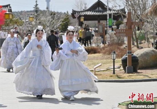 4月7日,在吉林省延吉市的中國朝鮮族民俗園內(nèi),游客身著朝鮮族服飾游玩。 中新社記者 張瑤 攝