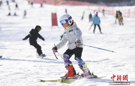 吉林霧凇冰雪節(jié)開(kāi)幕當(dāng)天,游客在中旅松花湖滑雪場(chǎng)暢滑!∈橛 攝