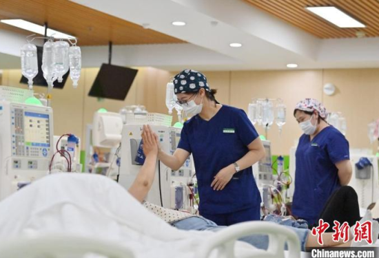 5月9日,長(zhǎng)春中醫(yī)藥大學(xué)附屬醫(yī)院腎病科門(mén)診透析室內(nèi),護(hù)士在為患者加油打氣!埇 攝