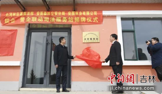 會(huì)后,在島安林場(chǎng)室外舉行了司法服務(wù)站揭牌儀式。為法官服務(wù)站、警長(zhǎng)服務(wù)站揭牌,院企、警企聯(lián)動(dòng)機(jī)制啟動(dòng)儀式勝利閉幕。院警企三方已通過(guò)協(xié)商達(dá)成共識(shí),并在當(dāng)?shù)?個(gè)林場(chǎng)設(shè)立司法服務(wù)站,為“接警到場(chǎng)”“送法到戶”,提供強(qiáng)有力的保障。