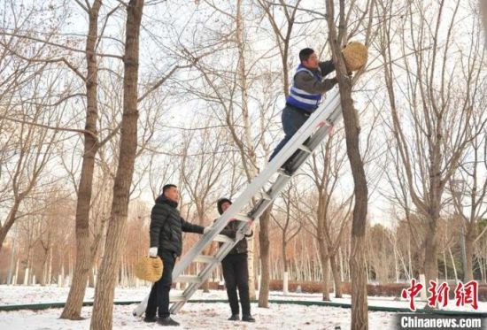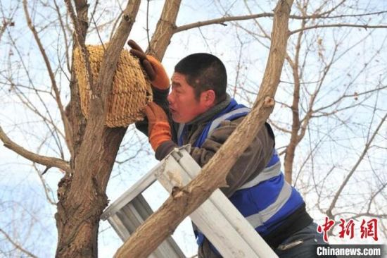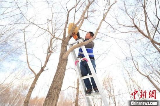 11月23日,趁著雪后天晴,吉林長春友誼公園的工作人員忙著維護(hù)樹上的草編鳥巢,并投放了鳥糧。該公園生態(tài)環(huán)境好、野生鳥類多,園方已經(jīng)連續(xù)三年在園區(qū)設(shè)置百余個草編鳥巢助鳥類安全過冬。