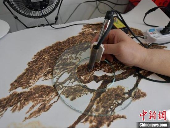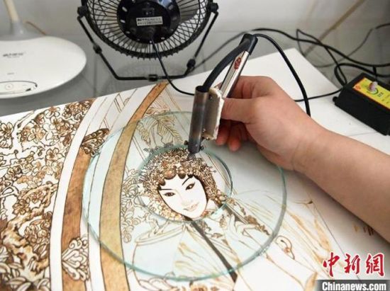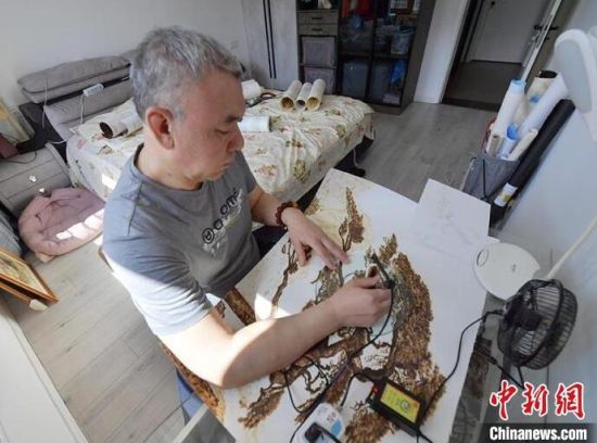 4月3日,吉林長春,56歲的長春市民王巖在工作室進(jìn)行烙畫創(chuàng)作。自幼熱愛繪畫的王巖,在機(jī)緣巧合下接觸到烙畫技藝,從此便悉心鉆研。烙畫又稱火筆畫,是指用火燒烙鐵在物體上熨出烙痕作畫的一項(xiàng)技藝。