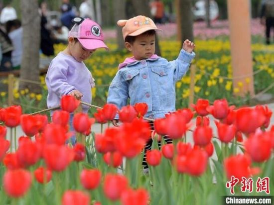 小朋友在盛開的郁金香旁玩耍。公園內(nèi)的郁金香迎來盛花期。民眾在盛開的郁金香旁打卡拍照。攝影愛好者正在拍攝盛開的郁金香。盛開的郁金香吸引大量民眾前來賞花。
