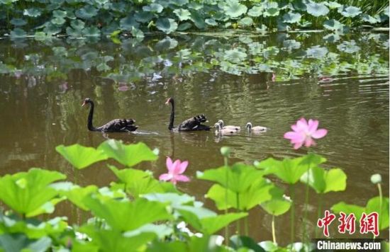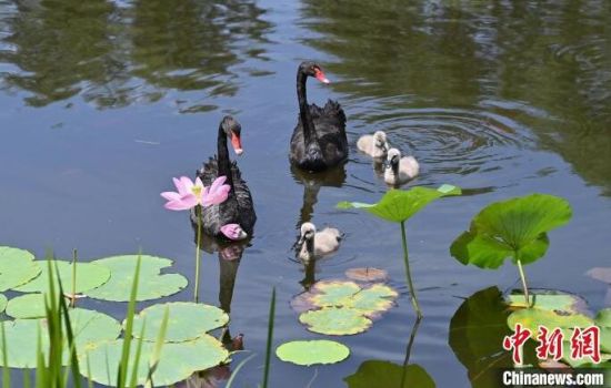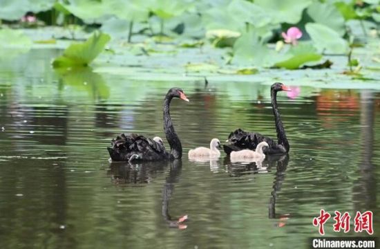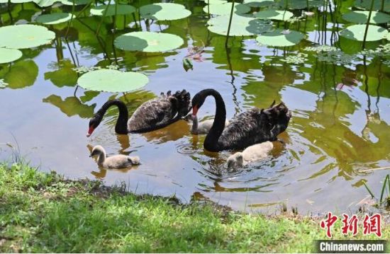 7月30日,在位于吉林省長春市的百花園內(nèi),三只剛剛出生的黑天鵝寶寶乖巧地守在爸爸媽媽身邊,暢游荷花池,十分愜意。(中新社記者 張瑤/攝)