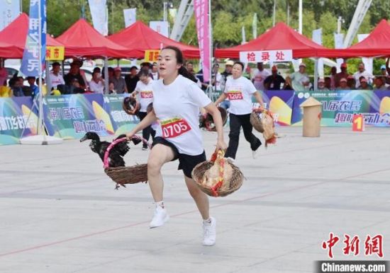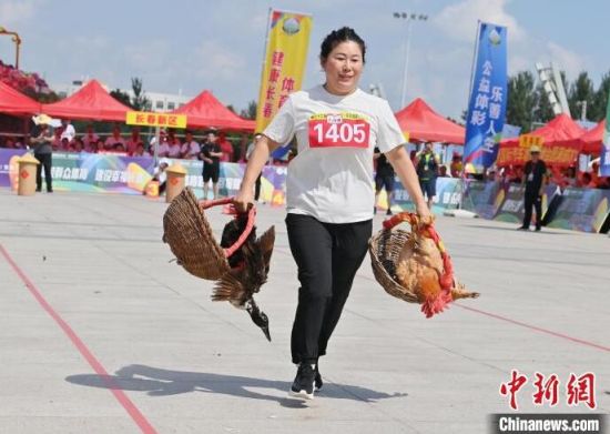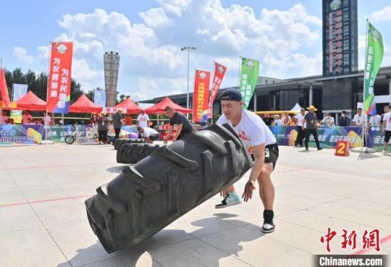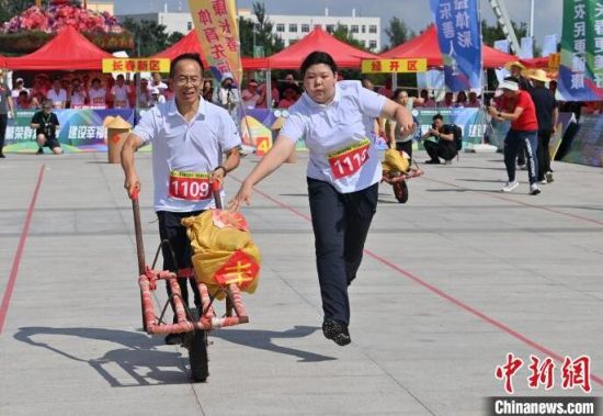 8月16日,吉林長春,農(nóng)民趣味運動會在長春農(nóng)博園精彩上演,運動會設置了“喜獲豐收”“回娘家”“農(nóng)田大力士”等充滿鄉(xiāng)村特色的比賽項目。圖為選手在“喜獲豐收”比賽中。中新社記者 張瑤 攝