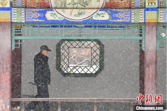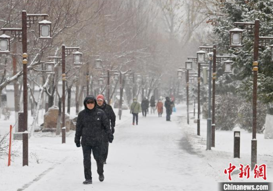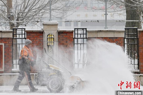 11月26日,吉林長(zhǎng)春,市民在清掃車(chē)上的積雪。當(dāng)天,吉林長(zhǎng)春迎來(lái)今冬首場(chǎng)明顯降雪天氣,整座城市披上銀裝。 中新社記者 張瑤 攝