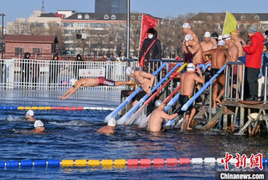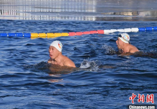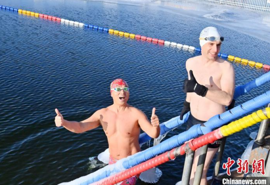 2025年1月1日,在長春南湖公園,冬泳愛好者破冰在湖水中暢游。當天,中外百余名冬泳愛好者齊聚南湖,以冬泳的方式迎接新年。中新社記者 張瑤 攝