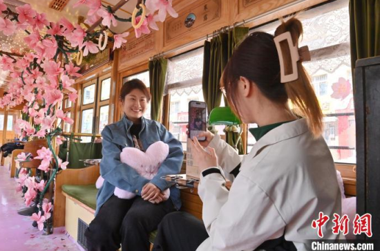 4月18日,吉林長(zhǎng)春,游客在54路文旅春日限定專列上拍照留念。該專列車廂內(nèi)外融入了桃花的設(shè)計(jì)元素,營(yíng)造出濃郁的春意,吸引了眾多游客前來打卡。中新社記者 張瑤 攝