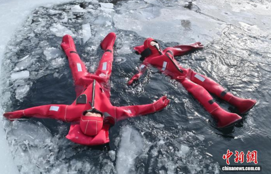 2月5日,吉林省長春市,一項(xiàng)獨(dú)特的冰浮項(xiàng)目吸引眾多游客前來體驗(yàn)。在嚴(yán)寒天氣中,參與者身穿醒目的紅色浮力裝備,悠然漂浮于冰面之上,感受別致的冰雪樂趣。圖為游客在下水前拍照留念。中新社記者 張瑤 攝