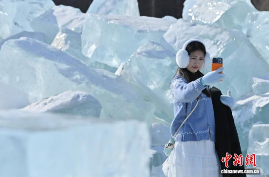 2月9日,在長春凈月潭國家森林公園內(nèi),由水庫天然冰塊堆砌而成的“藍冰”景觀,吸引市民打卡拍照!八{冰”是指致密堅硬的冰,因冰內(nèi)部空氣被擠掉而變得晶瑩透徹,這時陽光中波長較短的藍光被致密堅厚的冰層散射,冰塊便呈現(xiàn)出水晶般美麗的藍色。中新社記者 張瑤 攝