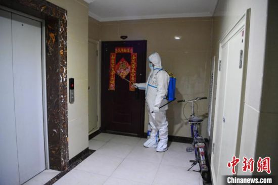 工作人員正在公共區(qū)域進(jìn)行消殺作業(yè) 張瑤 攝