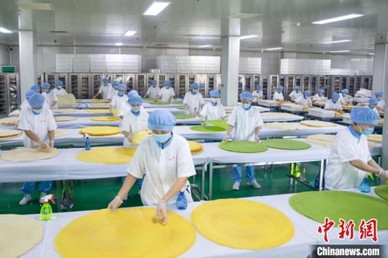 工人正在煎餅車(chē)間里工作!《鼗形麄鞑抗﹫D
