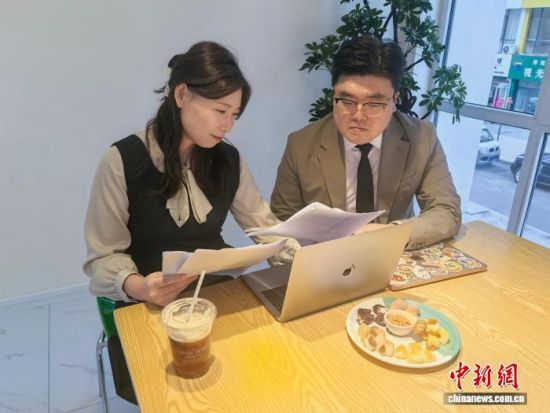 鄭鐘弼(右一)和愛人探討工作。石洪宇 攝